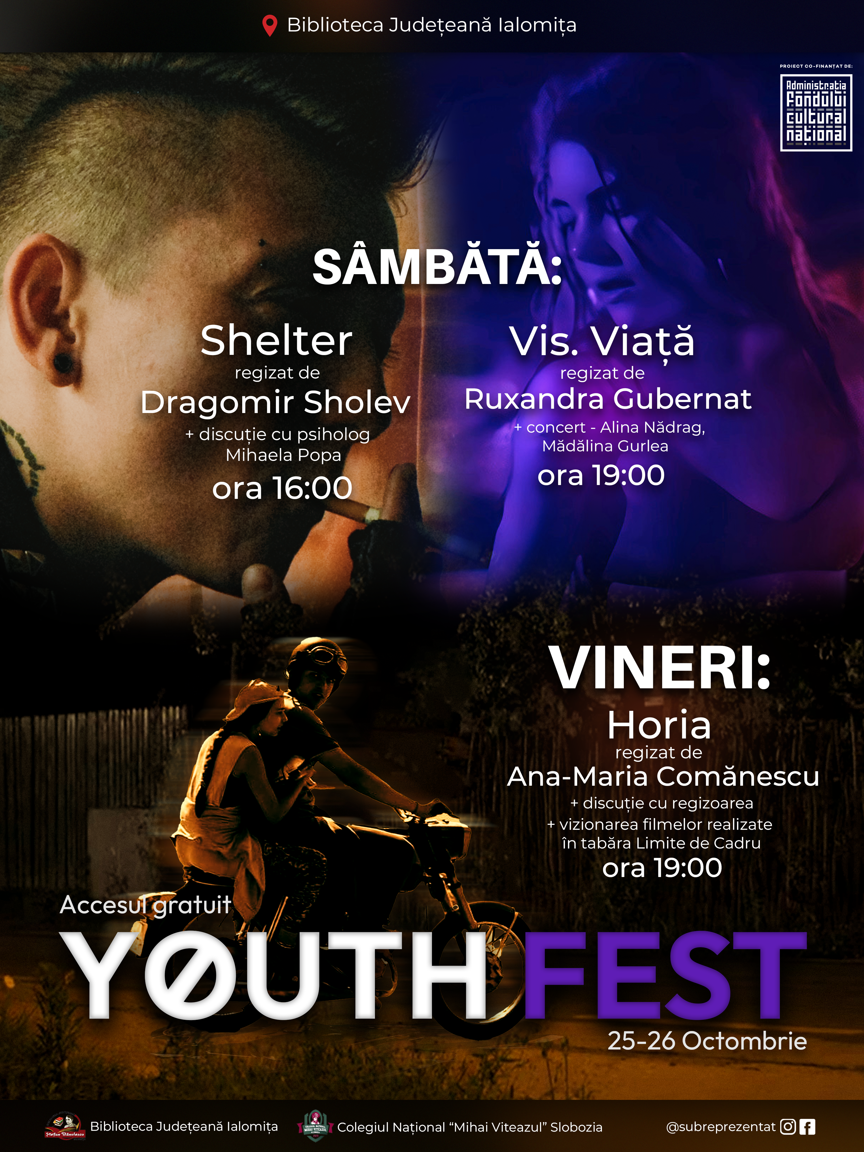 Youth Fest va avea loc la Biblioteca Județeană „Ștefan Bănulescu” din Slobozia între 25 și 26 octombrie, după cum urmează: